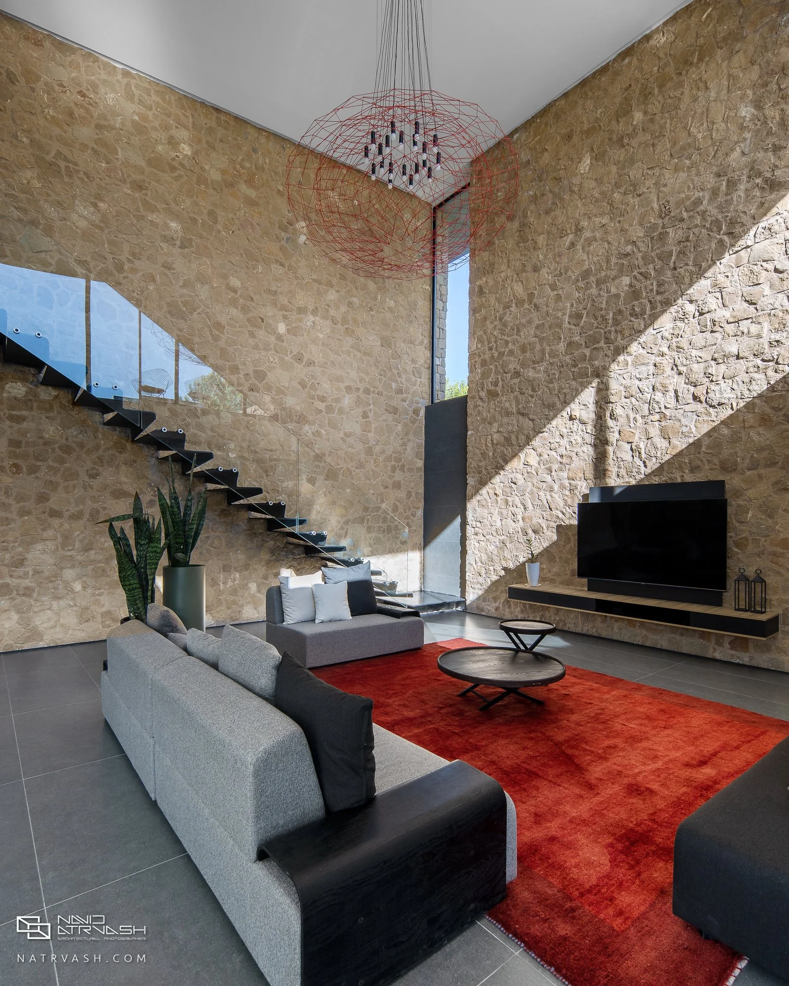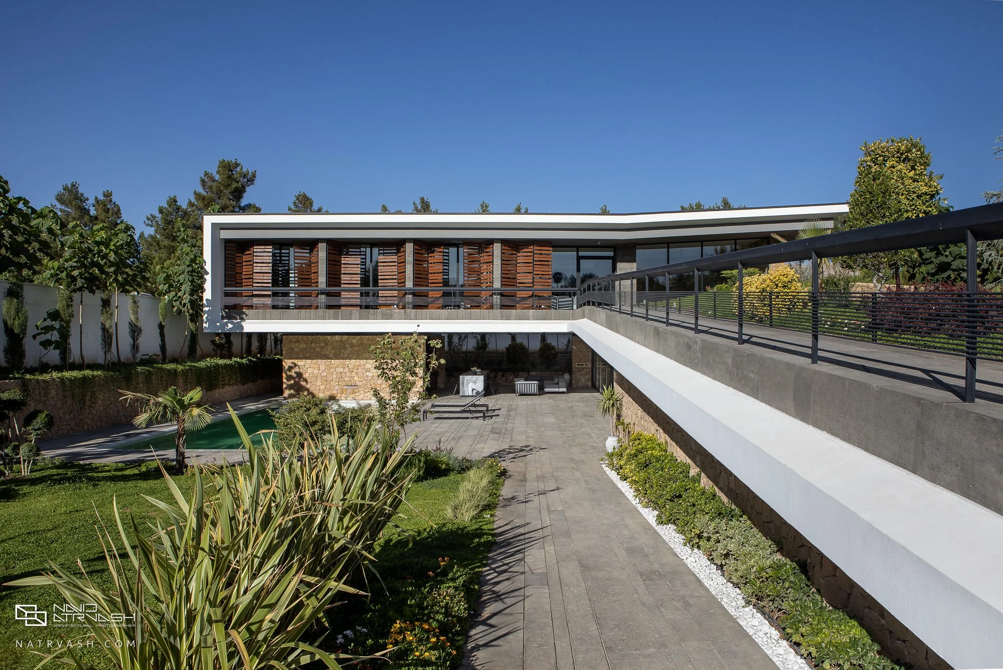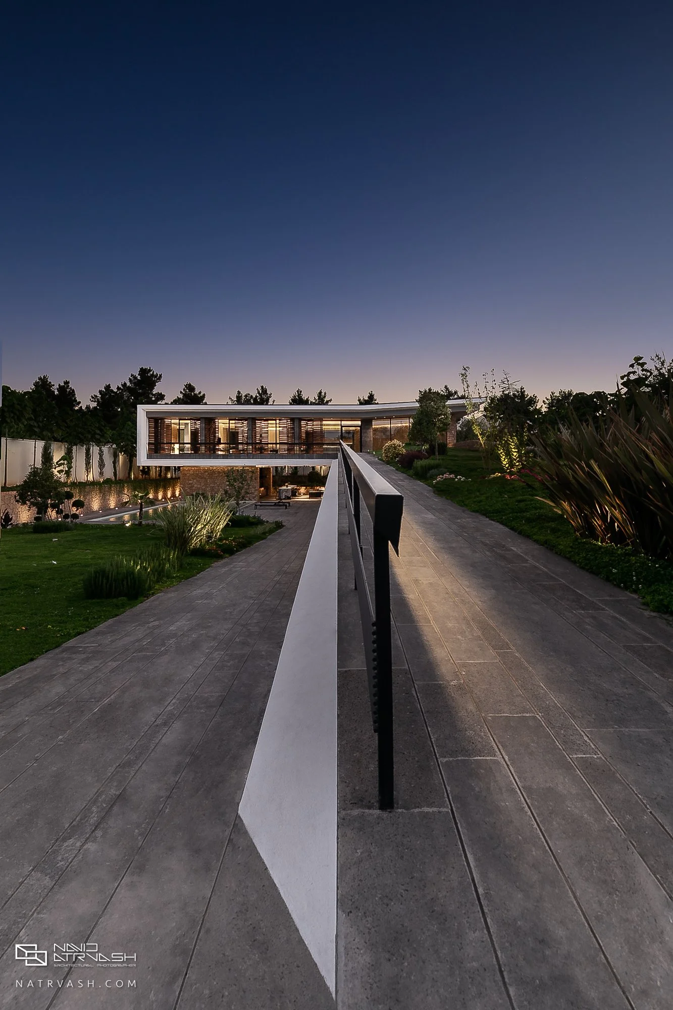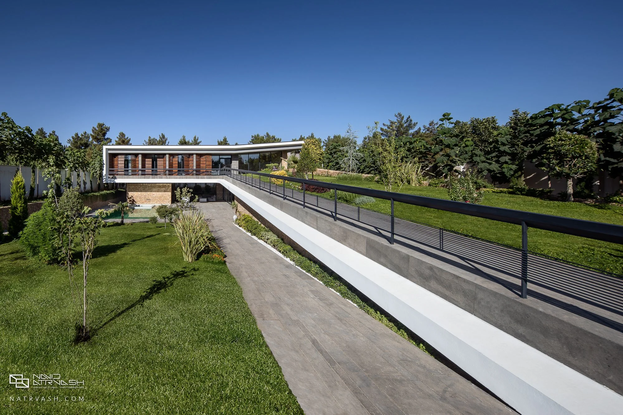 Villa Ramp, situated in the Gode Gowim area north of Shiraz, exemplifies a seamless integration of architecture and landscape. Once agricultural land, the site has transformed into a garden-city district, inspiring a design that eliminates boundaries between the built environment and nature. The villa is embedded into the terrain, with two ramps—one ascending to the private quarters and the other descending to public spaces—creating a fluid transition between structure and surroundings. The upper level houses bedrooms and a living area with adjustable wooden screens for controlled light and views, while the lower level, designed for gatherings, features retractable partitions to adapt to various occasions. Local stone clads the sunken portions, blending with the environment, while a suspended white concrete plane defines the villa’s form, appearing as an extension of the landscape.