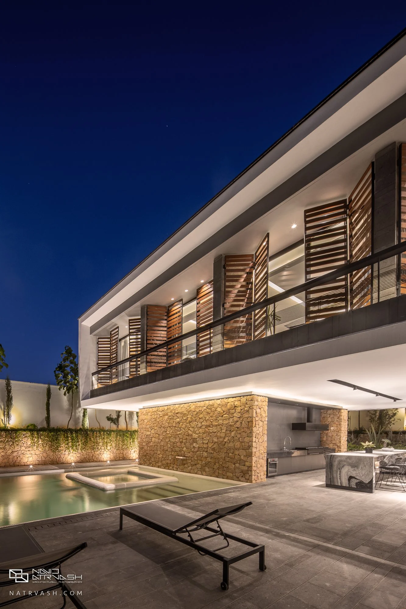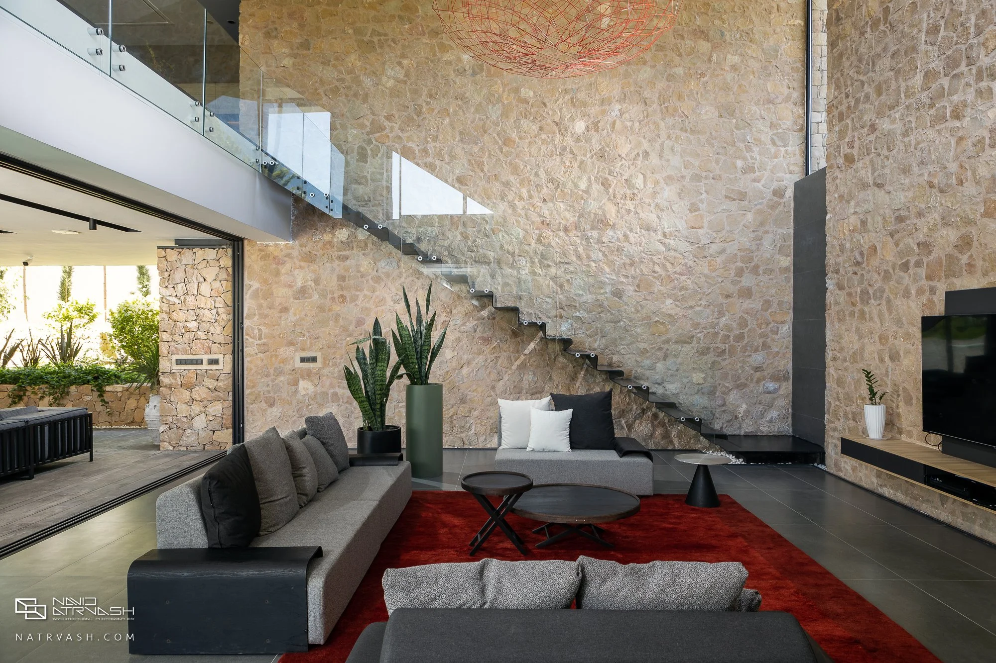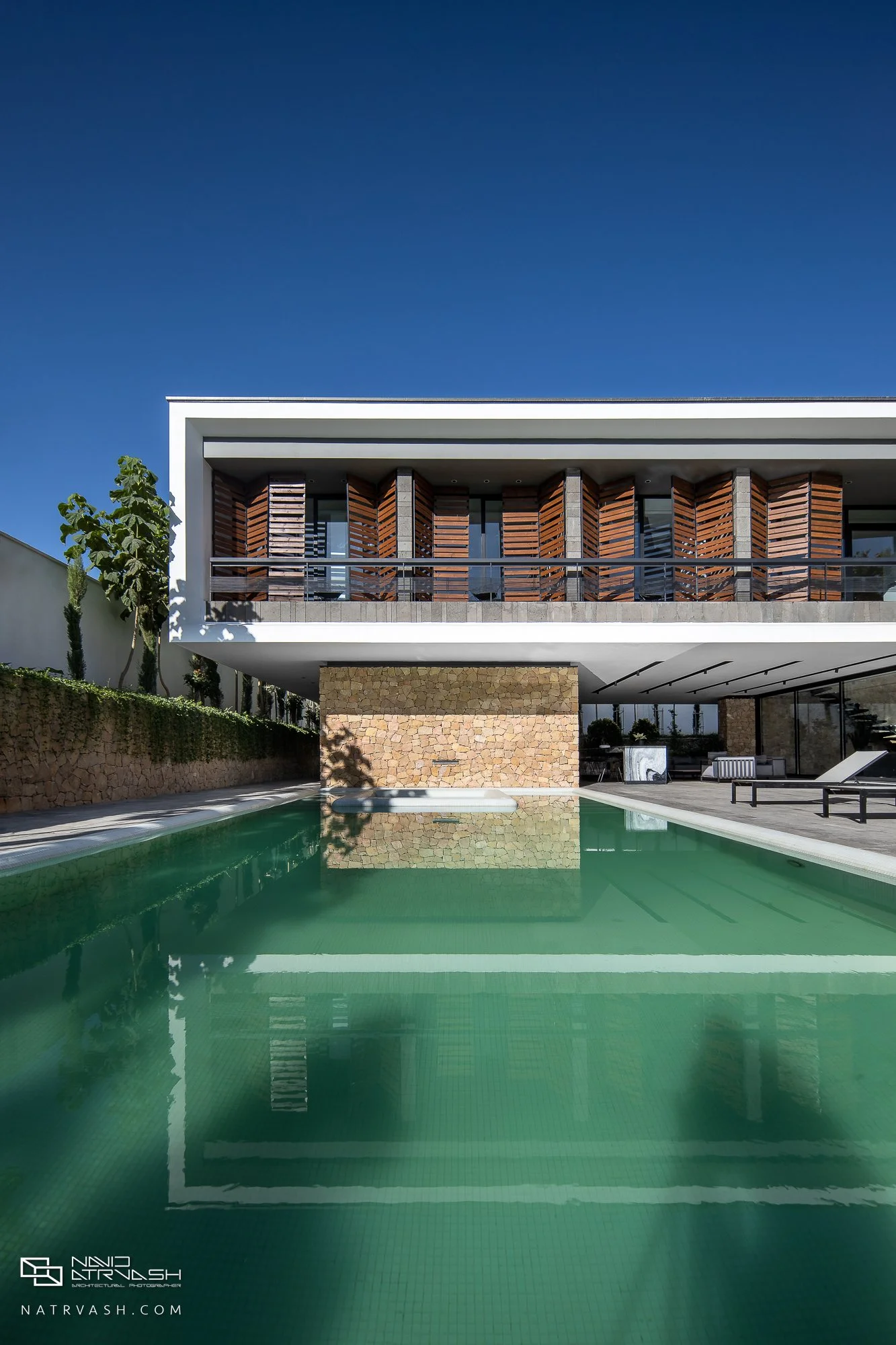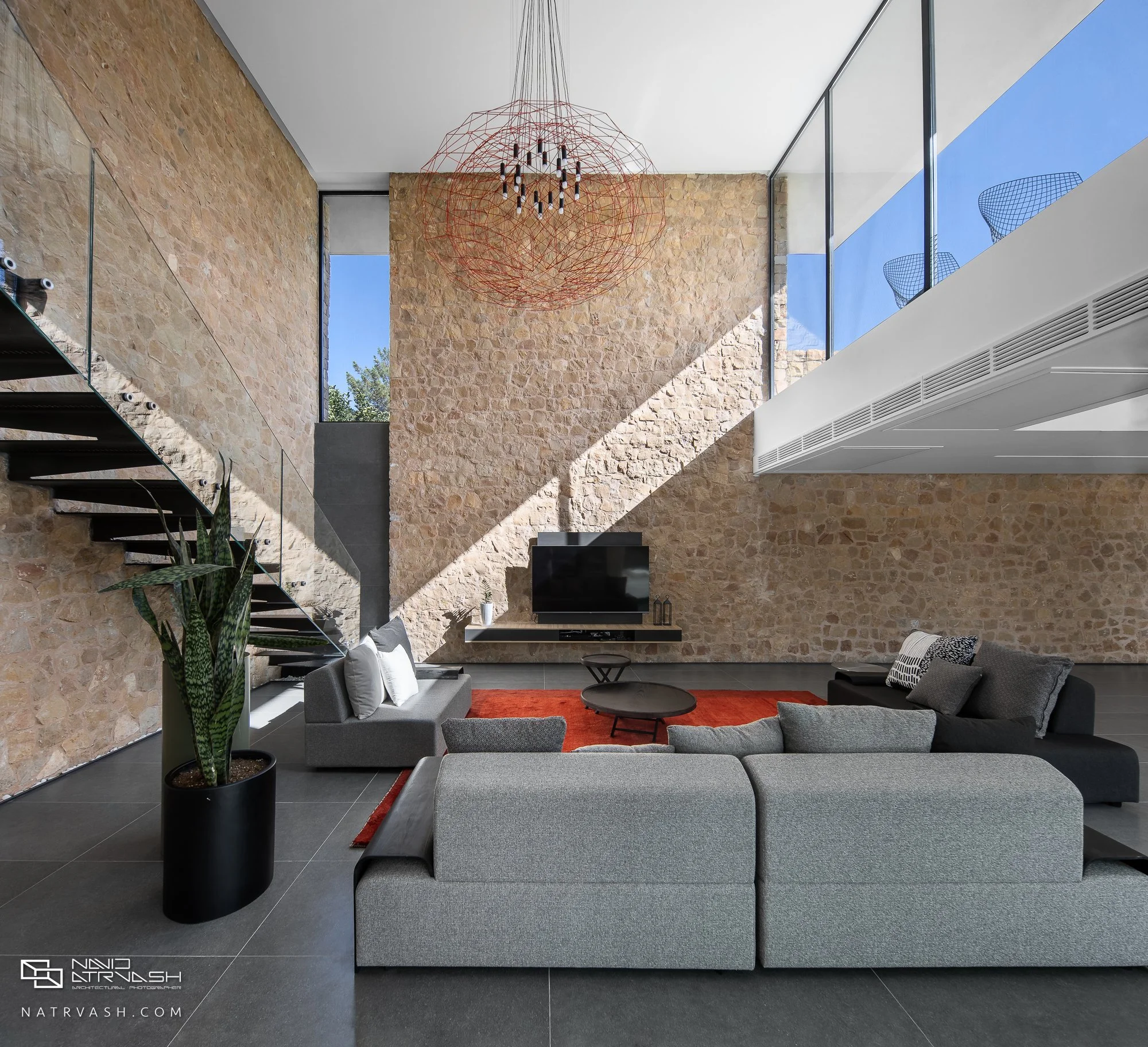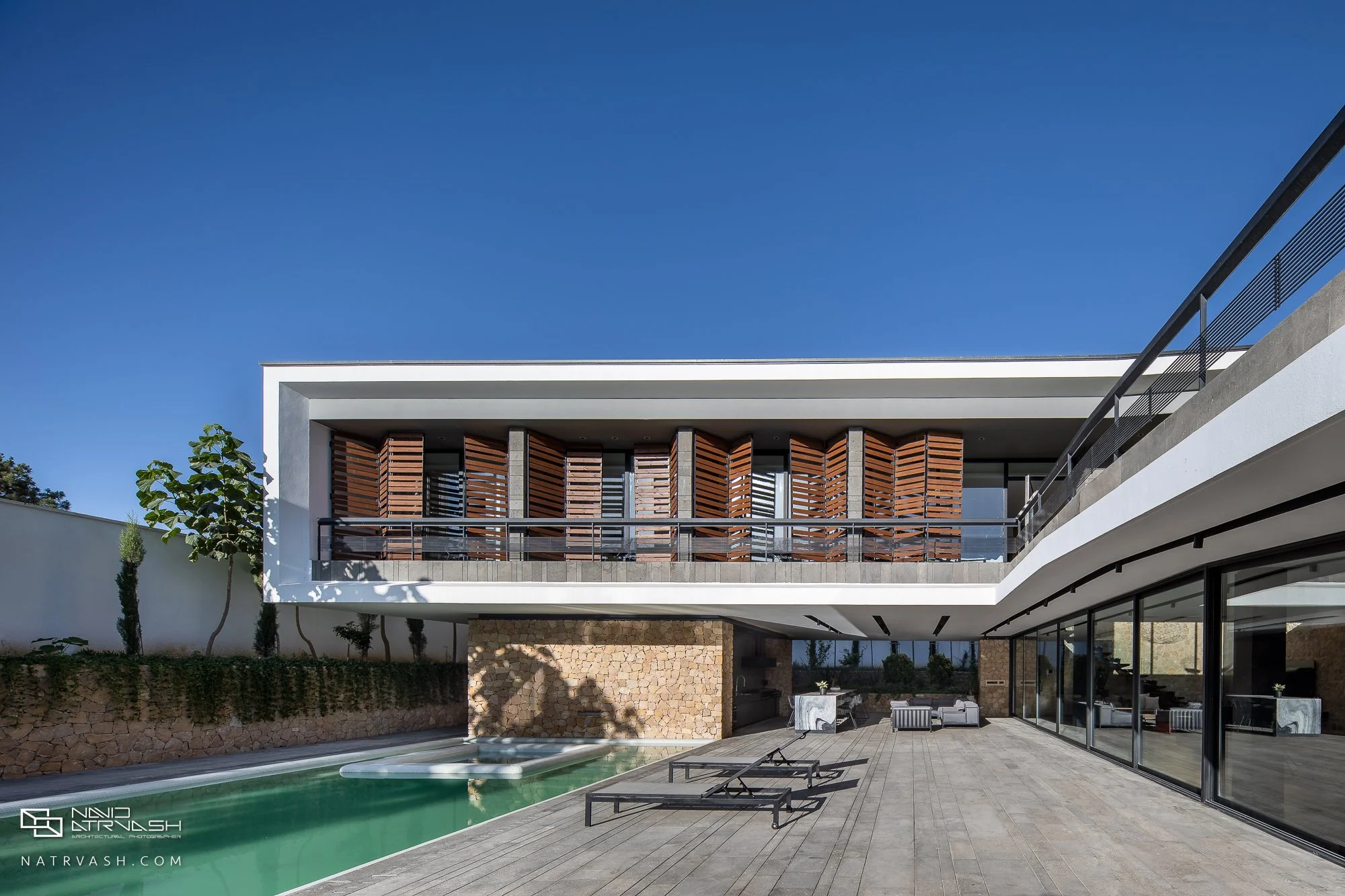 Villa Ramp, situated in the Gode Gowim area north of Shiraz, exemplifies a seamless integration of architecture and landscape. Once agricultural land, the site has transformed into a garden-city district, inspiring a design that eliminates boundaries between the built environment and nature. The villa is embedded into the terrain, with two ramps—one ascending to the private quarters and the other descending to public spaces—creating a fluid transition between structure and surroundings. The upper level houses bedrooms and a living area with adjustable wooden screens for controlled light and views, while the lower level, designed for gatherings, features retractable partitions to adapt to various occasions. Local stone clads the sunken portions, blending with the environment, while a suspended white concrete plane defines the villa’s form, appearing as an extension of the landscape.