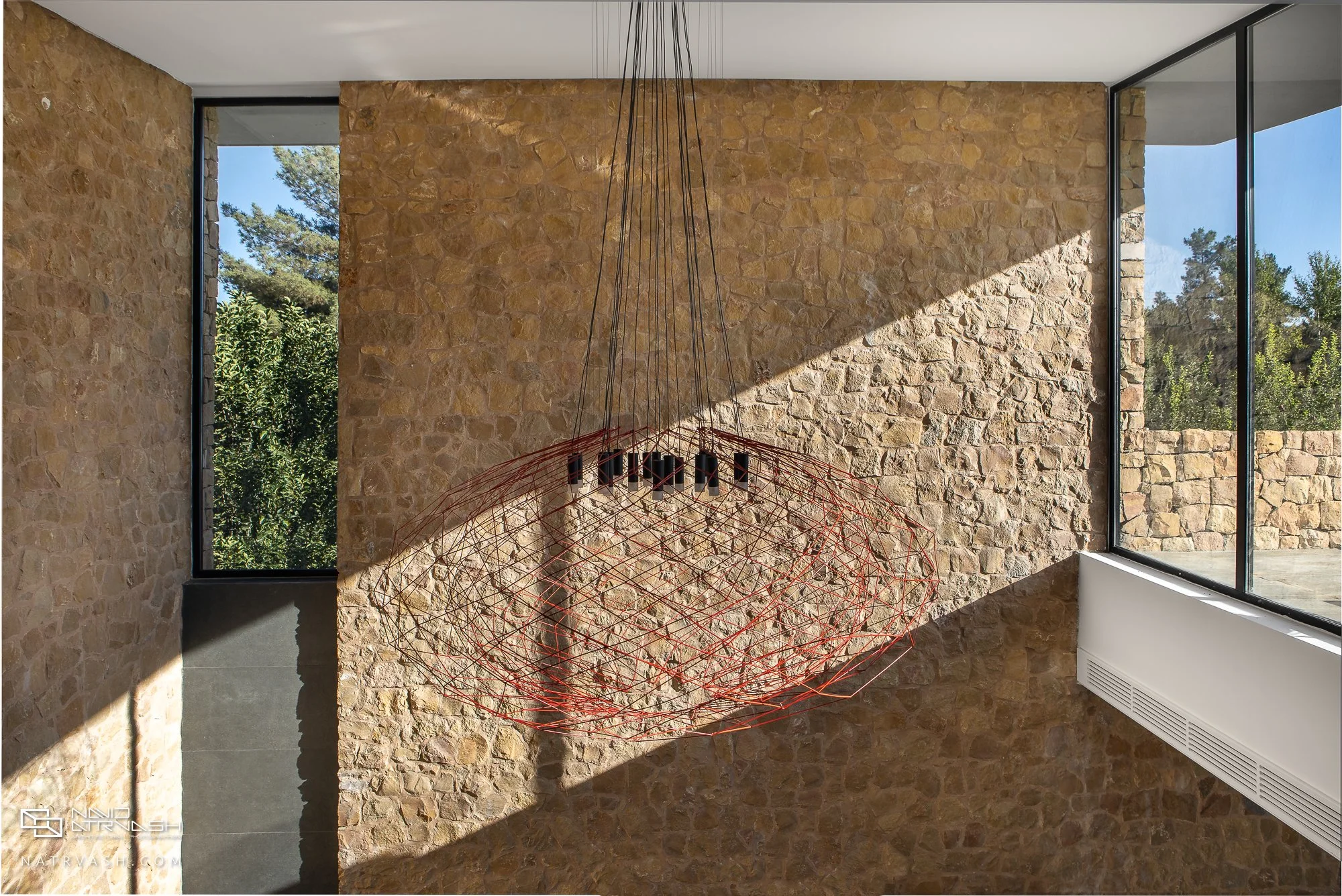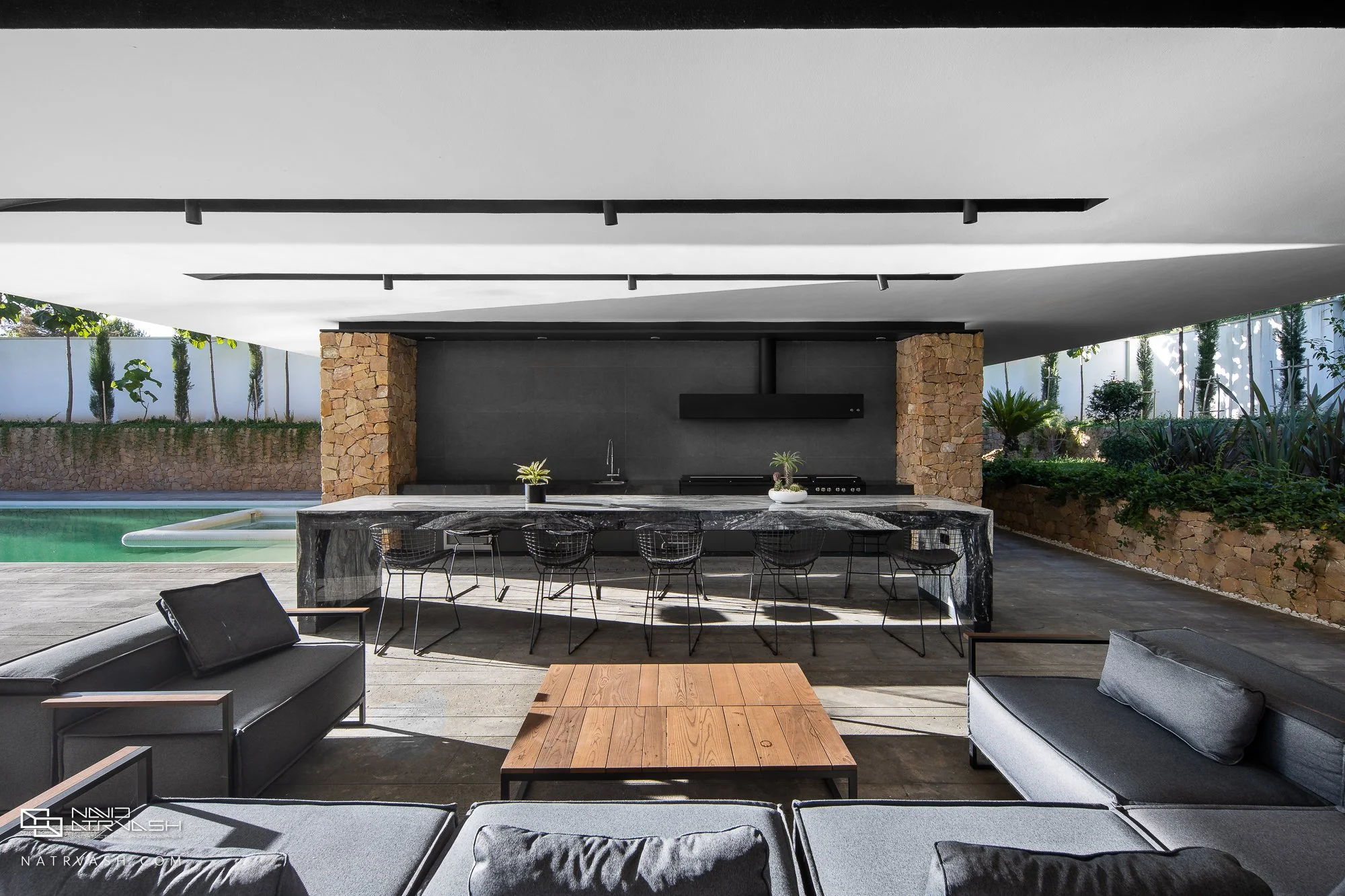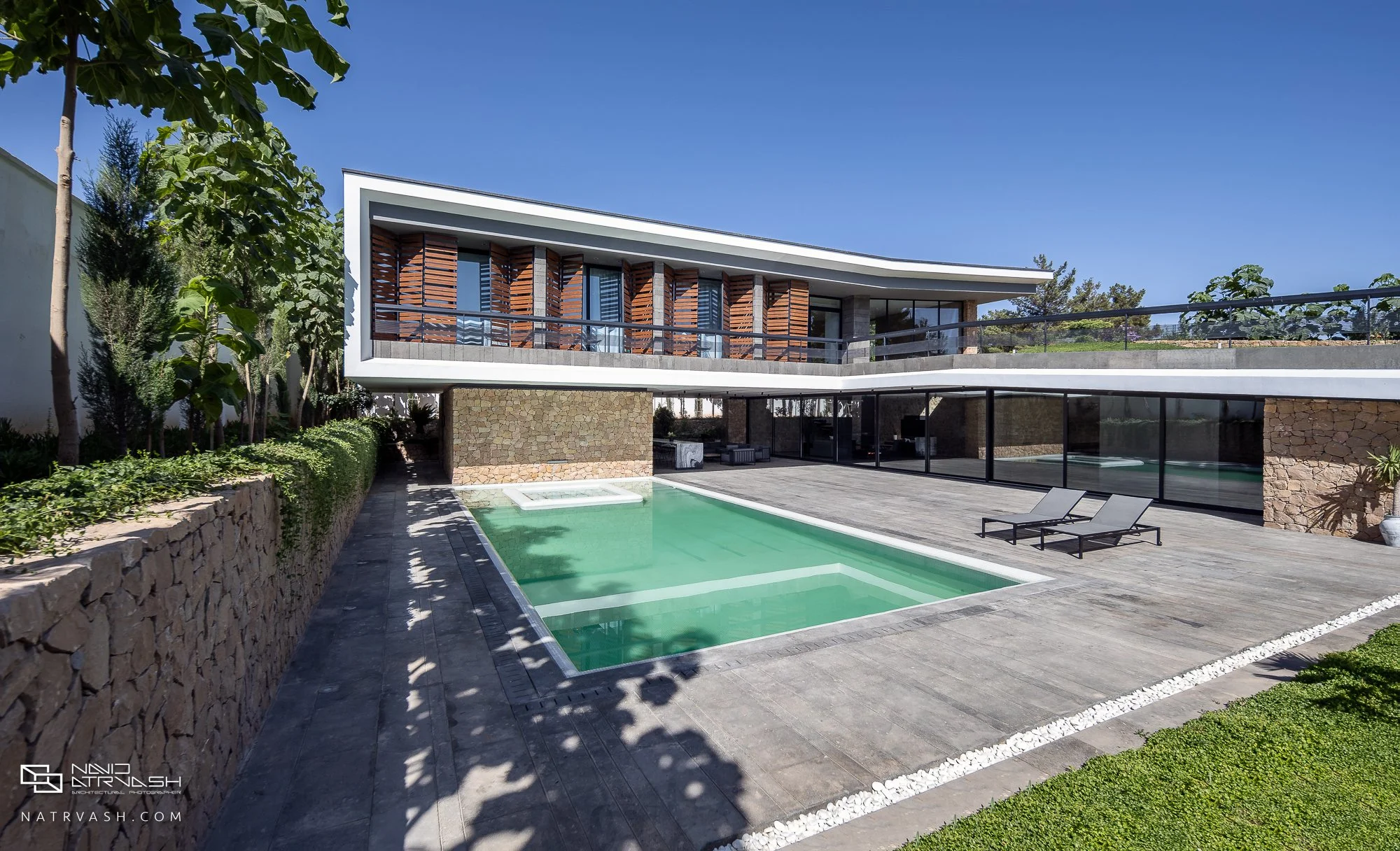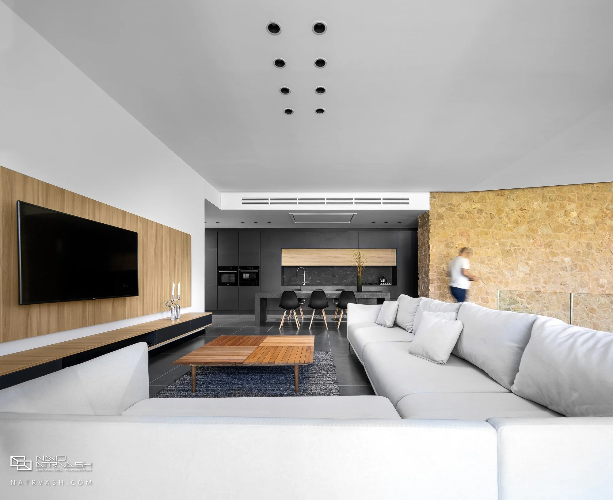 Villa Ramp, situated in the Gode Gowim area north of Shiraz, exemplifies a seamless integration of architecture and landscape. Once agricultural land, the site has transformed into a garden-city district, inspiring a design that eliminates boundaries between the built environment and nature. The villa is embedded into the terrain, with two ramps—one ascending to the private quarters and the other descending to public spaces—creating a fluid transition between structure and surroundings. The upper level houses bedrooms and a living area with adjustable wooden screens for controlled light and views, while the lower level, designed for gatherings, features retractable partitions to adapt to various occasions. Local stone clads the sunken portions, blending with the environment, while a suspended white concrete plane defines the villa’s form, appearing as an extension of the landscape.